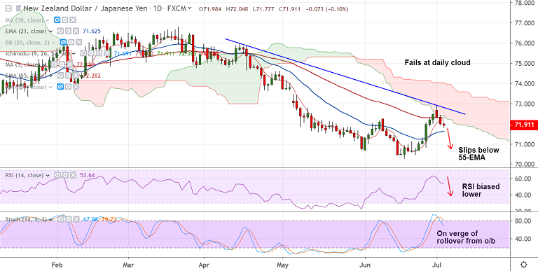 NZD/JPY fails to extend break above cloud base, edges lower from 8-week highs at 72.93.