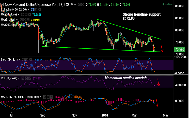 - NZD/JPY has taken strong trendline support at 72.89 on Apr 7th trade and edged higher.