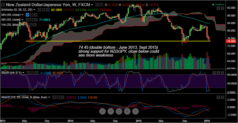 - 74.45 is double-bottom (June 2013 and Sept 2015) a strong support levelClose below could see further weakness in the pair, declines till 69.30 then look likely.