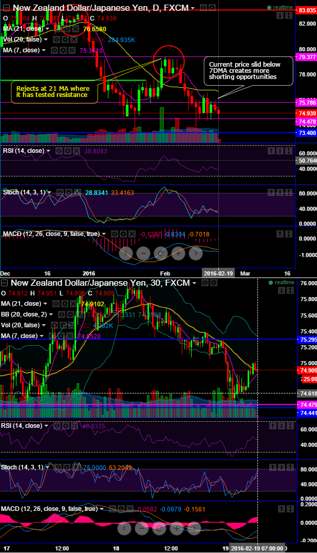 NZD/JPY held stronger at 74.478 levels which has acted as an important support in the recent past as well and has attempted to bounce back.