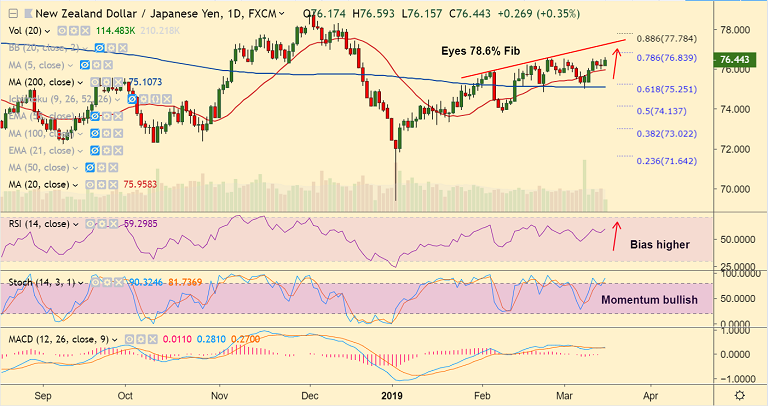 Recommendation: Good to go long on dips. SL: 76, TP: 76.80/ 77.20