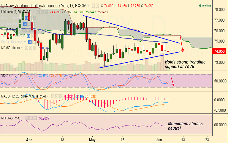 - NZD/JPY holding strong trendline support at 73.75, break below will see further weakness.