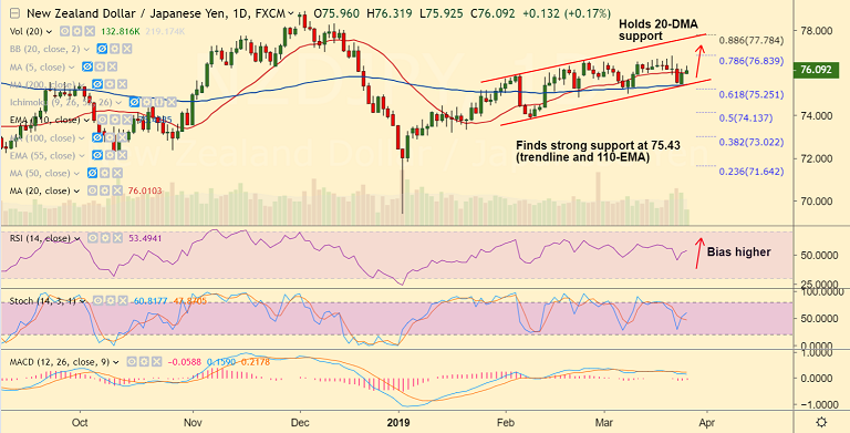 - The pair is trading in a rising channel pattern and has bounced off strong support at 75.43 (channel base and 110-EMA).