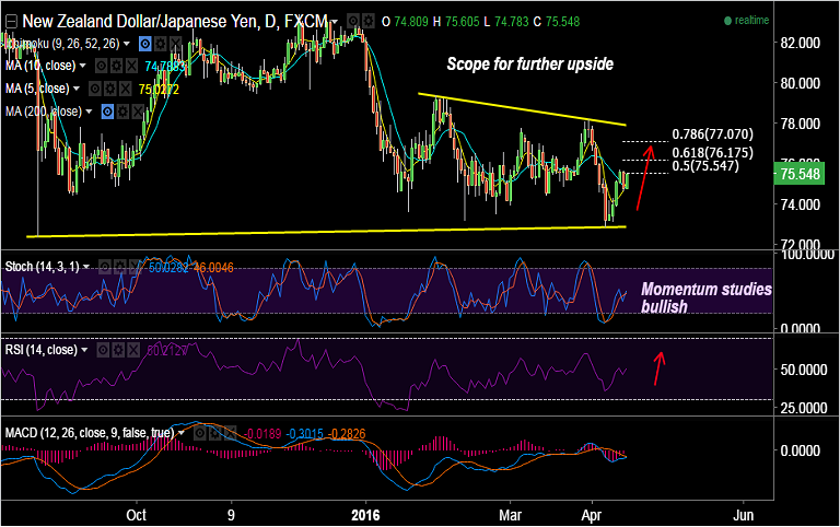 - Technicals also support upside in the pair. Stochs and RSI are biased higher, 5-DMA shows a bullish crossover on 10-DMA and MACD line is on the verge of a bullish crossover on signal line.