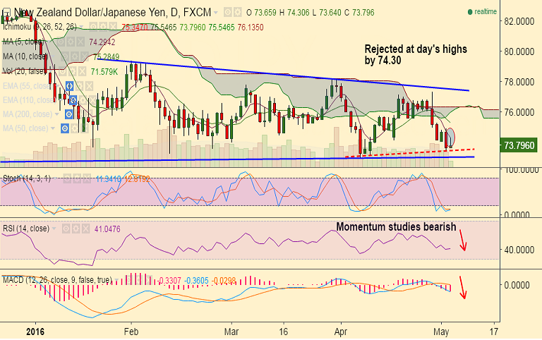 - Immedaite resistance is seen at 74.30 (5-DMA), ahead of 74.81 (May 2nd highs).