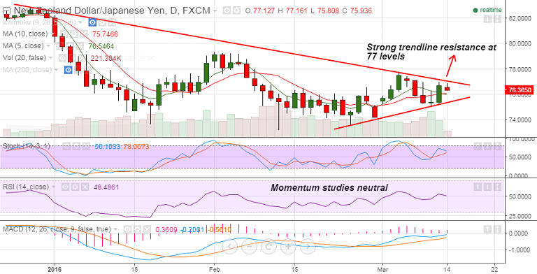 - The pair finds strong resistance at 77 levels which is falling trendline connecting 77.80 (Mar 3rd highs), 82.67 (Dec 31st high), 82.86 (Dec 29th highs).