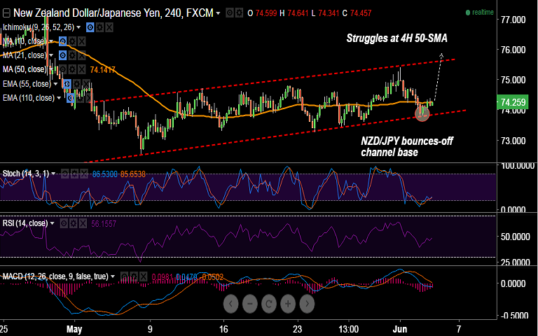 - NZD/JPY is showing a reversal from channel base. The pair has hit lows of 73.81 before edging higher to currently trade at 74.26 levels.