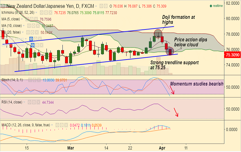 - NZD/JPY is extending retrace from recent multi-week highs of 78.21 (Mar 31st).