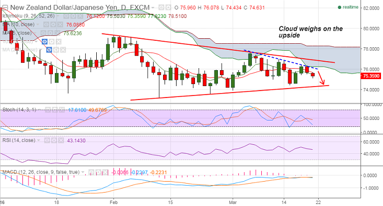 - Resistances for the pair are aligned at 75.70 (10-DMA), 76 and the 76.15 (falling trendline).