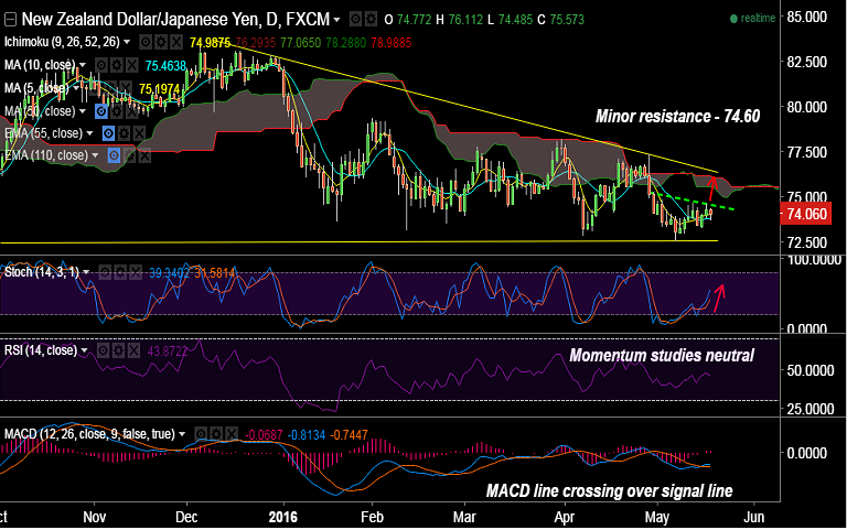 - NZD/JPY stiff resistance at 74.50, further gains only on break above.