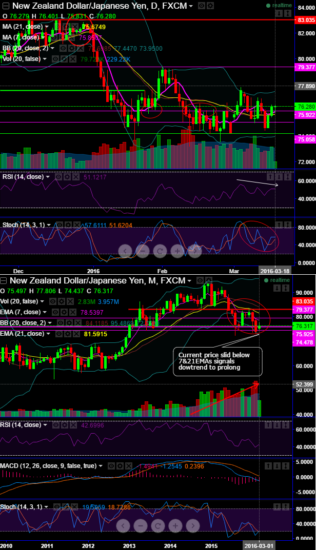 It has broken supports at 75.922 levels on intraday basis, you can observe how the price behaviour of this pair on either side after breaching this level in the recent historical evidences (see circled areas). So, 75.922 would determine the next short term direction, breakout on either side would be closely watched.