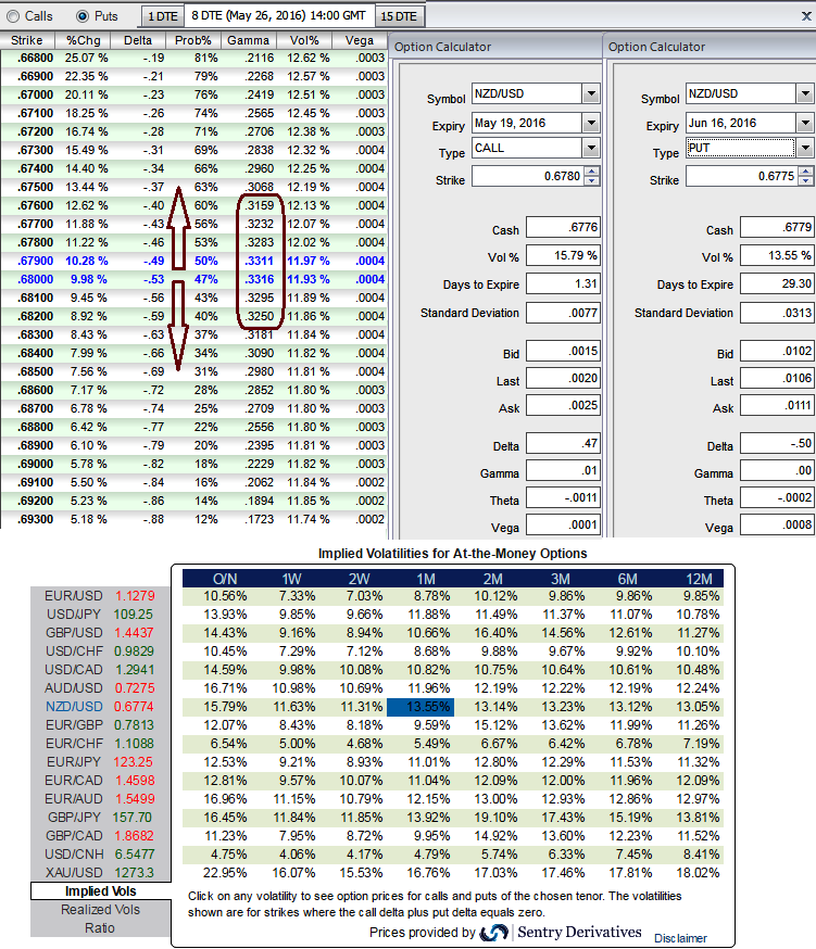 We've just referred 0.25% OTM put strikes and their vols, it still shows 0.47 as delta values for underlying outrights with 52% of probabilities, that means 52% chances of finishing in-the-money which is why for demonstration purpose, as shown in the figure we consider the NZDUSD ATM instruments while formulating option strips strategy at spot FX ref: 0.6837.