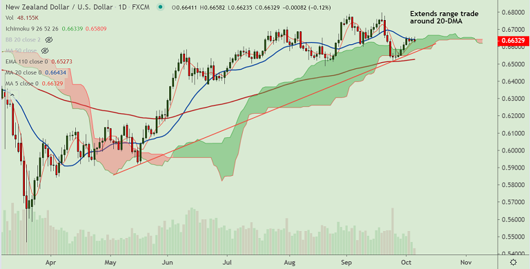 NZD/USD was trading 0.11% lower on the day at 0.6634 at around 08:10 GMT. The major is extending sideways for the 3rd straight session and technical bias is neutral.