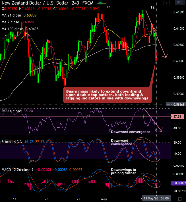 The pair forms double top pattern which is bearish in nature, with top 1 at 0.6176 and top 2 at 0.6155 levels, bears is most likely to extend minor downtrend upon double top pattern. While both leading and lagging indicators are in line with the prevailing downswings (refer daily chart).