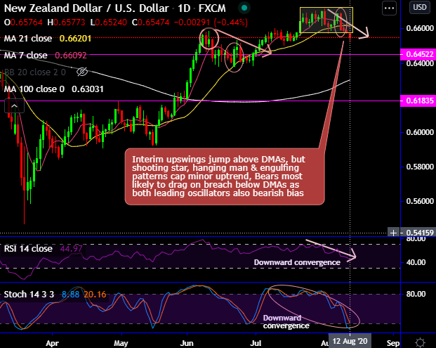 For now, the pair is trading at 0.6545 (while articulating), bears are most likely to drag upon breach below DMAs as both leading oscillators are also bearish bias.