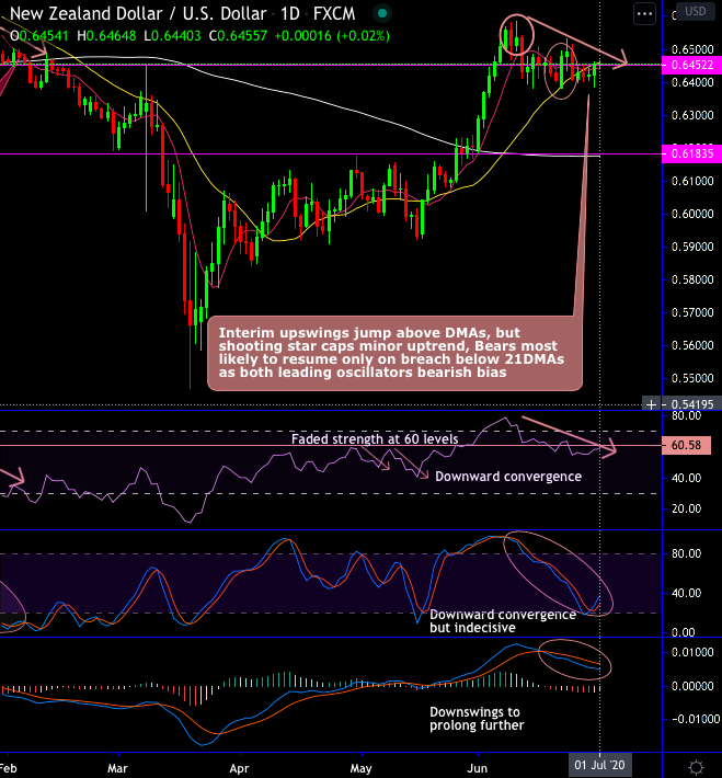 Trade tips: At spot reference: 0.6455 levels (while articulating), contemplating above technical rationale, one can execute boundary options strategy. Such exotic option with upper strikes at 0.65 and lower strikes at 0.6375 levels likely to fetch exponential yields than the spot moves.