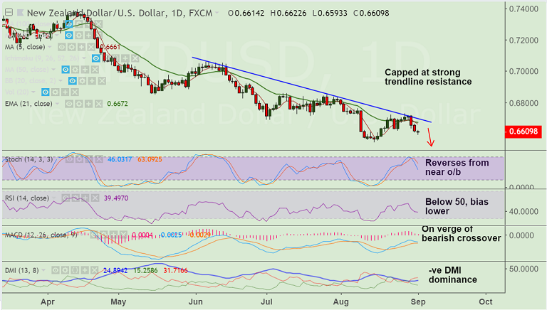 - Price action has sipped below 20-DMA and is on track to test 0.6544 (Aug 1 lows)