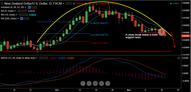 - NZD/USD price action dives below the cloud and the pair has made a clean break below the 0.6500 support.