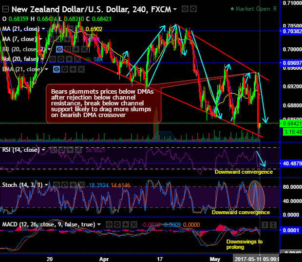 On the back of RBNZ’s status quo monetary policy, bears of NZDUSD in the major downtrend have resumed after testing the stiff resistances of 0.7038 and 21EMA levels (refer daily charts).