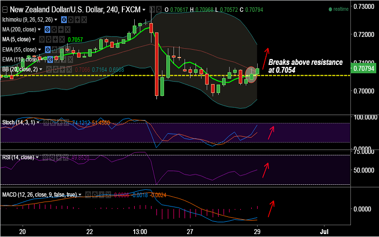 - NZD/USD has broken stiff trendline resistance at 0.7054 to hit highs of 0.7096 on the day.