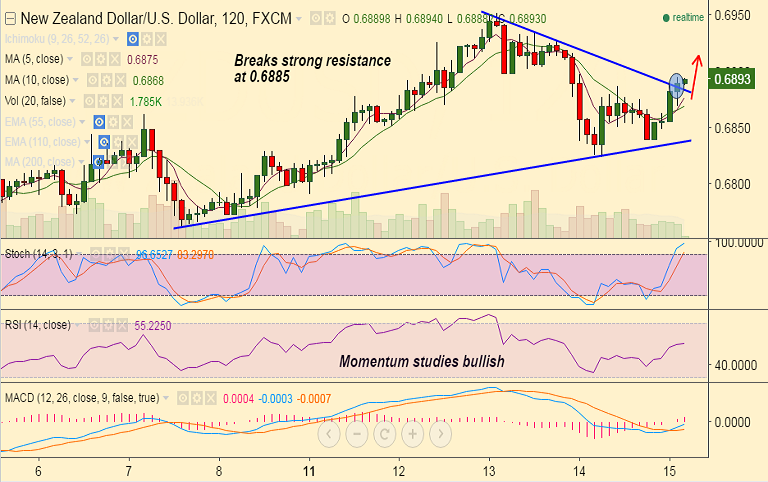 - On the Technical side, the pair has broken strong trendline resistance at 0.6885 on the 2-hourly charts.