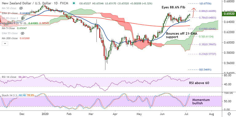 21-EMA is strong support at 0.6440. Break below could see dip till 200-DMA. Violation at 200-DMA negates bullish bias.