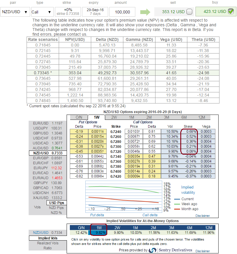 Contemplating the above IV indications and fundamental aspects, we could foresee the underlying spot FX (NZDUSD) would drag towards OTM put strikes as per the IV nutshell as shown in the above diagram. As a result, in such scenario, OTM call writing would be a smart trading idea.