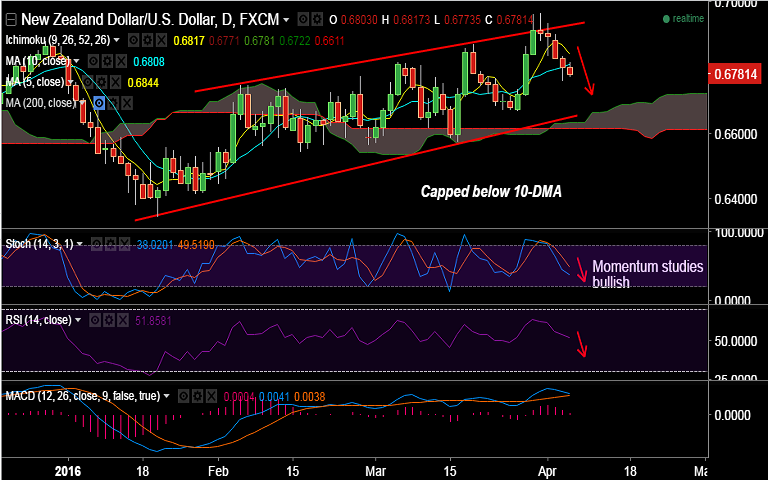 - Immediate resistance is seen at 0.6807 (10-DMA) ahead of 0.6843 (5-DMA). While supports are located at 0.6720 (Mar 22nd lows) and then 0.6680 (Dec 17th lows).