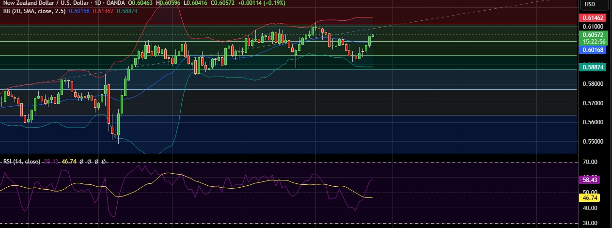 • Immediate resistance is located at 0.6110(23.6%fib), any close above will push the pair towards 0.6145 (Higher BB).