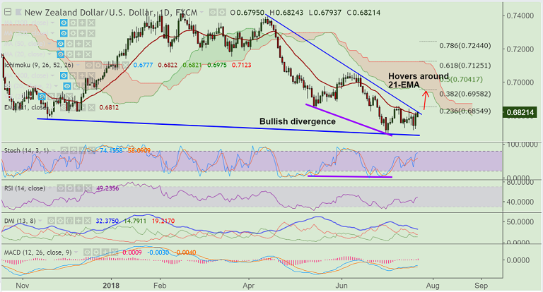 - The pair has edged above 21-EMA at 0.6812 and is hovering around major trendline resistance at 0.6825.