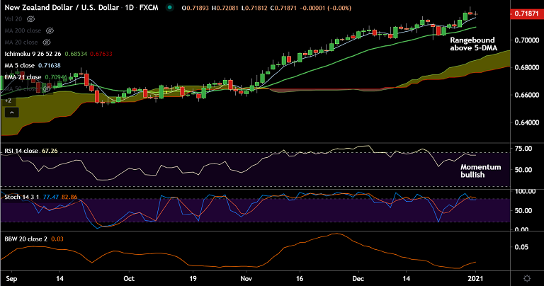 Summary: NZD/USD trades with a strong bullish bias. Weakness in the greenback likely to aid upside. Scope for test of 88.6% Fib at 0.7320 in the week. Close below 5-DMA could see minor weakness.