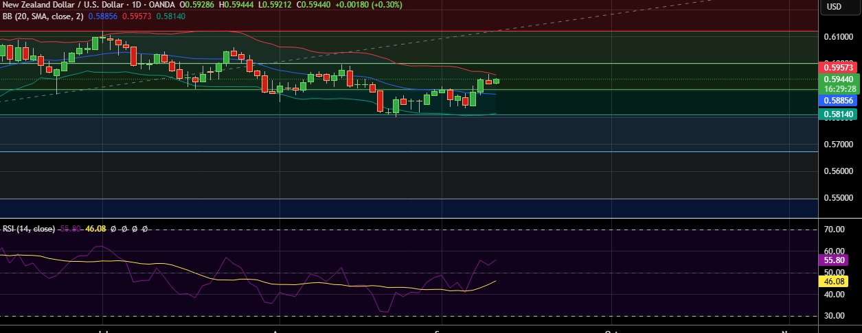 • Immediate resistance is located at 0.5963(Higher BB), any close above will push the pair towards 0.5998(38.2%fib).