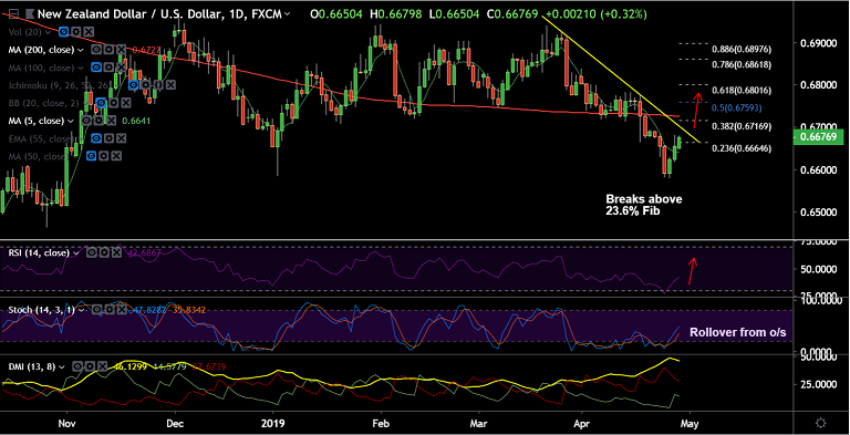 - Major trend is bearish, stiff resistance seen at 0.6713 (converged 20-DMA and 21-EMA)