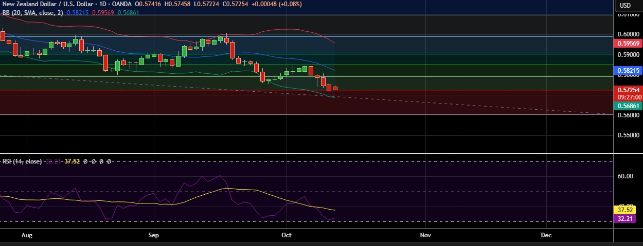 • Support is seen at 0.5717(23.6%fib) and break below could take the pair towards 0.5689(Lower BB).