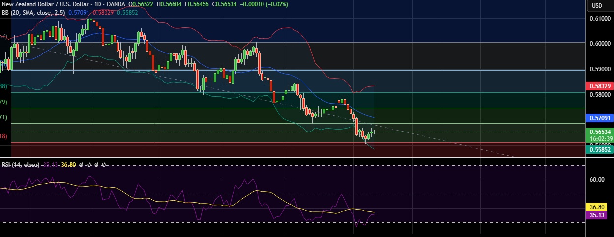 • Support is seen at 0.5609(23.6%fib) and break below could take the pair towards 0.5590 (Lower BB).