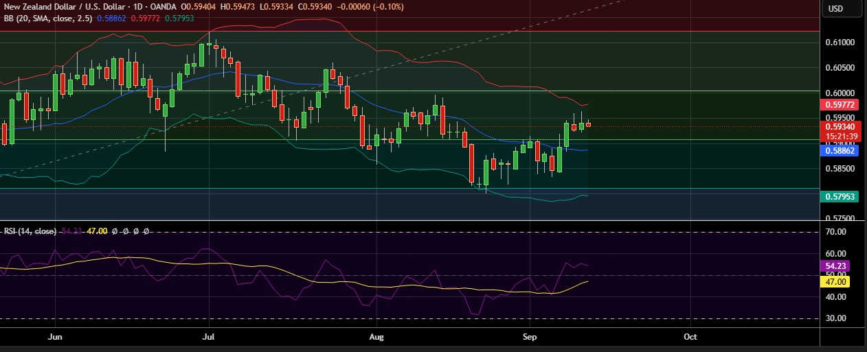 • Immediate resistance is located at 0.5975(Higher BB), any close above will push the pair towards 0.6008(38.2%fib).