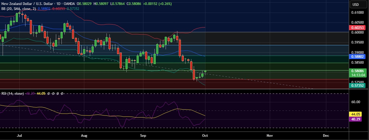 • Support is seen at 0.5765(23.6%fib)and break below could take the pair towards 0.5736 (Lower BB).