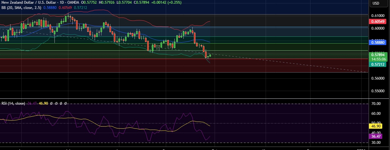 • Support is seen at 0.5756(23.6%fib)and break below could take the pair towards 0.5731(Lower BB).
