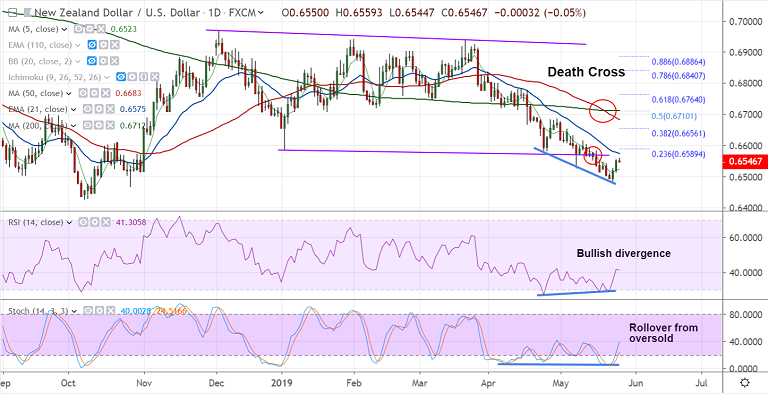Support levels - 0.6523 (5-DMA), 0.65, 0.6481 (May 23 low)