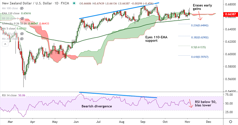 Immediate support is seen at 110-EMA at 0.6561. Break below will see dip till 23.6% Fib at 0.6484 ahead of 200-DMA at 0.6391.