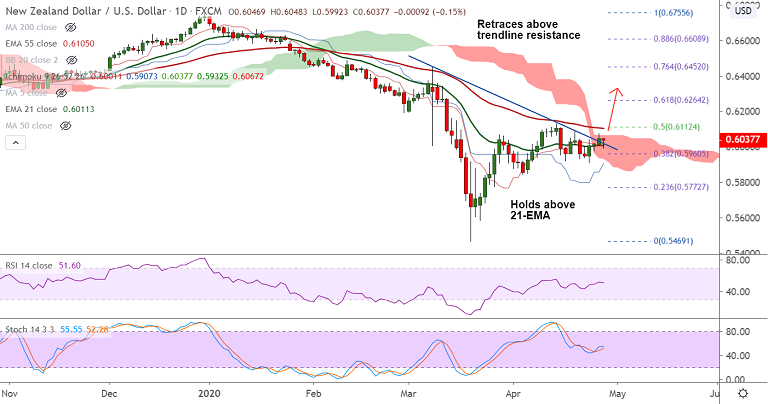 Decisive breakout above daily cloud will confirm further upside. Next major hurdle lies at 55-EMA at 0.6105 ahead of 21W EMA at 0.6208 and 61.8% Fib at 0.6242.