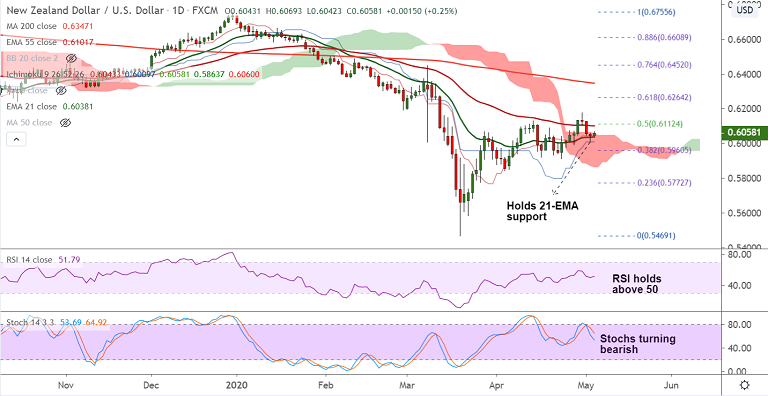 On the flipside, the pair is holding support at 21-EMA, breach below will see more weakness.