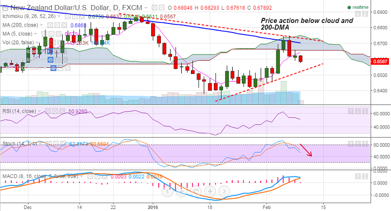 - The pair has seen retrace from falling trendline resistance (tested on 4th and 5th Feb) and is currently below daily cloud and 200-DMA.