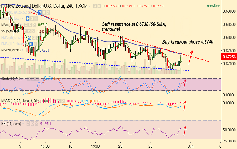 - The pair finds stiff resistance at 0.6738 (trendline & 4H 50-SMA), break above required for further upside.