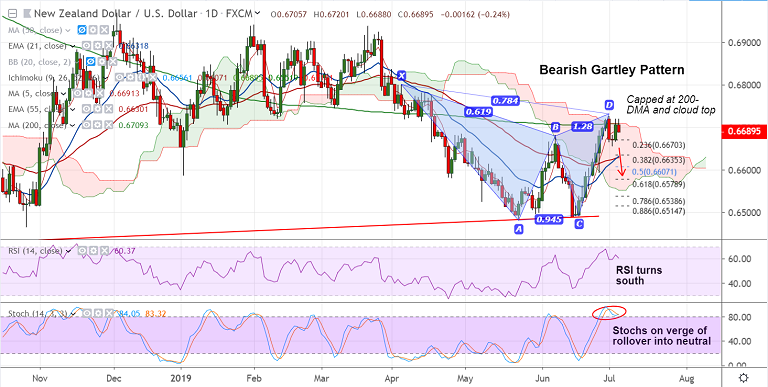 200-DMA (0.6709) and cloud top (0.6710) offer stiff resistance. Upside only on breakout above.