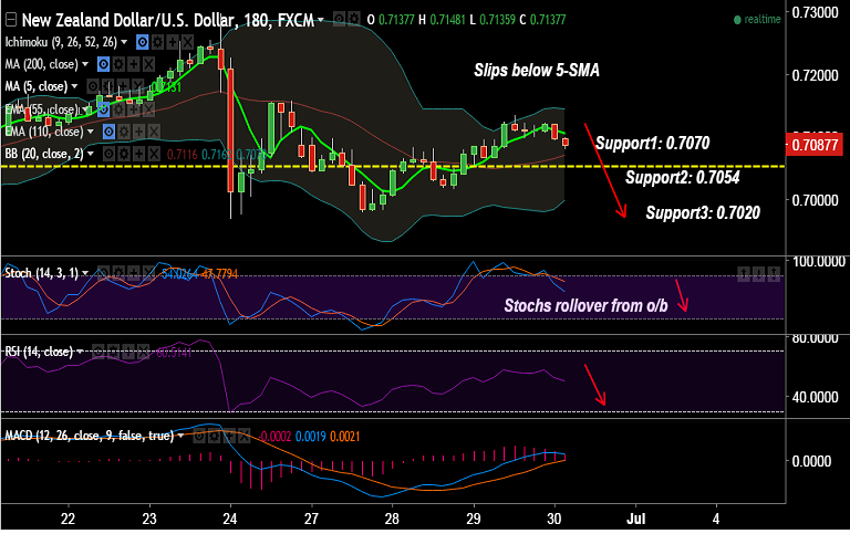- The pair finds strong support at 0.7070 (rising trendline and 5-DMA), break below could accentuate downside.