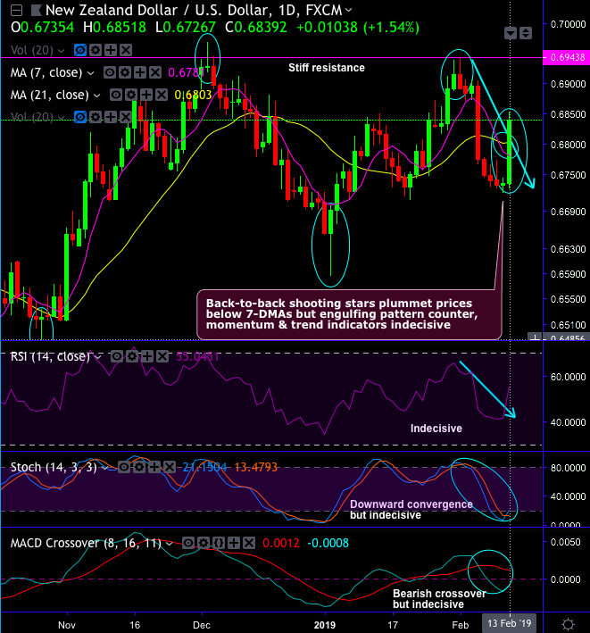 Technical Chart And Candlestick Patterns: NZDUSD has formed back-to-back shooting stars at 0.6914 and 0.6890 levels that plummet prices below 7-DMAsbut engulfing pattern pop-up today to counter previous bearish swings, while momentum and trend indicators are indecisive.
