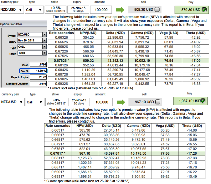 The current IV of NZDUSD call is higher side at 14.59% which is good for writers, usually if the Vega of a long option position is positive and the implied volatility rises or dips, the above stated option prices are directly proportional to the implied volatility.