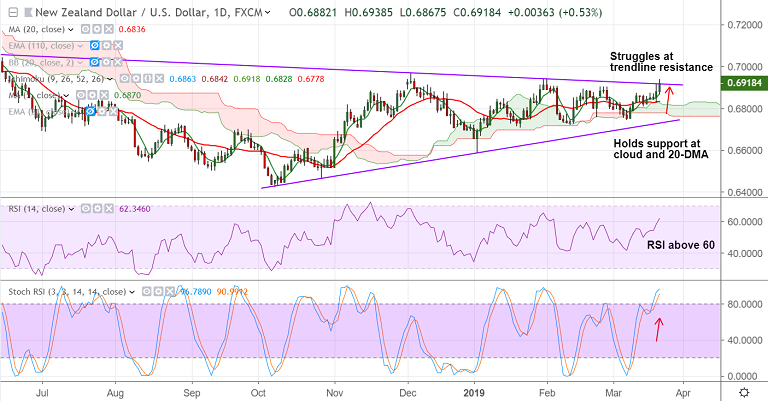- Price action has bounced off support at daily cloud and 20-DMA. Upside finds strong resistance at 0.6915 (trendline).