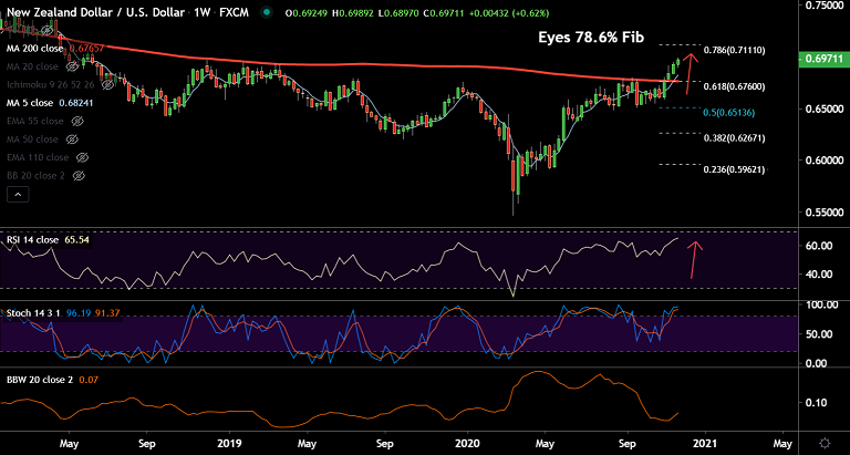 On the flipside, 5-DMA is immediate support at 0.6930. Break below could see minor weakness. Retrace below 200W MA will negate any bullish bias.